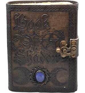 Step back in time when you use this antiqued looking book of shadows. Triple moon on the cover with an embedded blue stone Each page is filled with aged paper with rough edges. Latch closure.