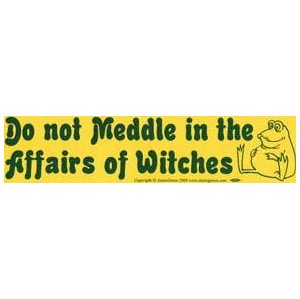 Playfully printed in green upon a white backdrop, this bumpersticker reads "Do not Meddle in the Affairs of Witches," with a confused looking frog sitting on the right side.