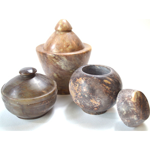 Crafted from natural soapstone, this elegant trio of Gini jars is perfect for storing herbs, incense, resins, or sacred keepsakes. Each jar comes with a matching lid to preserve freshness and energy. Soapstone is known for its grounding properties and natural beauty, making these jars both practical and spiritually aligned. A timeless addition to any altar, apothecary, or sacred space. Larges is approximately 3" in height, Medium is 2" and 1 3/4" each with there own unique lid and color variations.