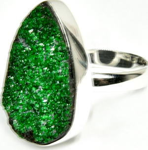 Uvarovite is a rare member of the Garnet family that beams you with its lustrous green coloring. Finely handcrafted sterling silver ring in a teardrop shape. Stamped .925 with stone measuring approximately 1" long and 5/8" wide. Size 6