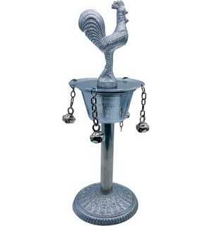 Osun takes the form of the roaster perched on a cup that sits on a pedestal. This Santeria tool stands almost 10".